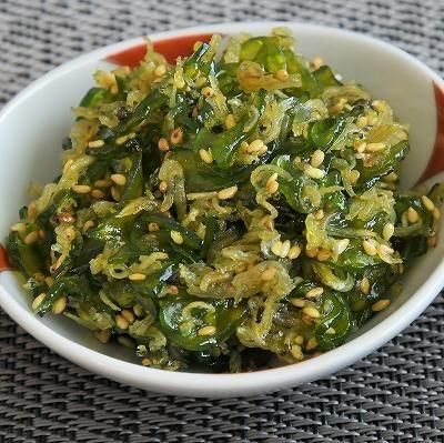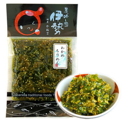 原材料 茎わかめ(三重県答志島産)、砂糖、しょうゆ、ちりめん(三重鳥羽答志産)、水あめ、還元水飴、醸造酢、ごま、発酵調味料、しその実、たんぱく加水分解物、食塩、酵母エキス、寒天/調味料(アミノ酸等)、保存料(ソルビン酸k)、甘味料(ステビア)、香料、着色料(黄4、青1)、(一部に小麦・大豆を含む)